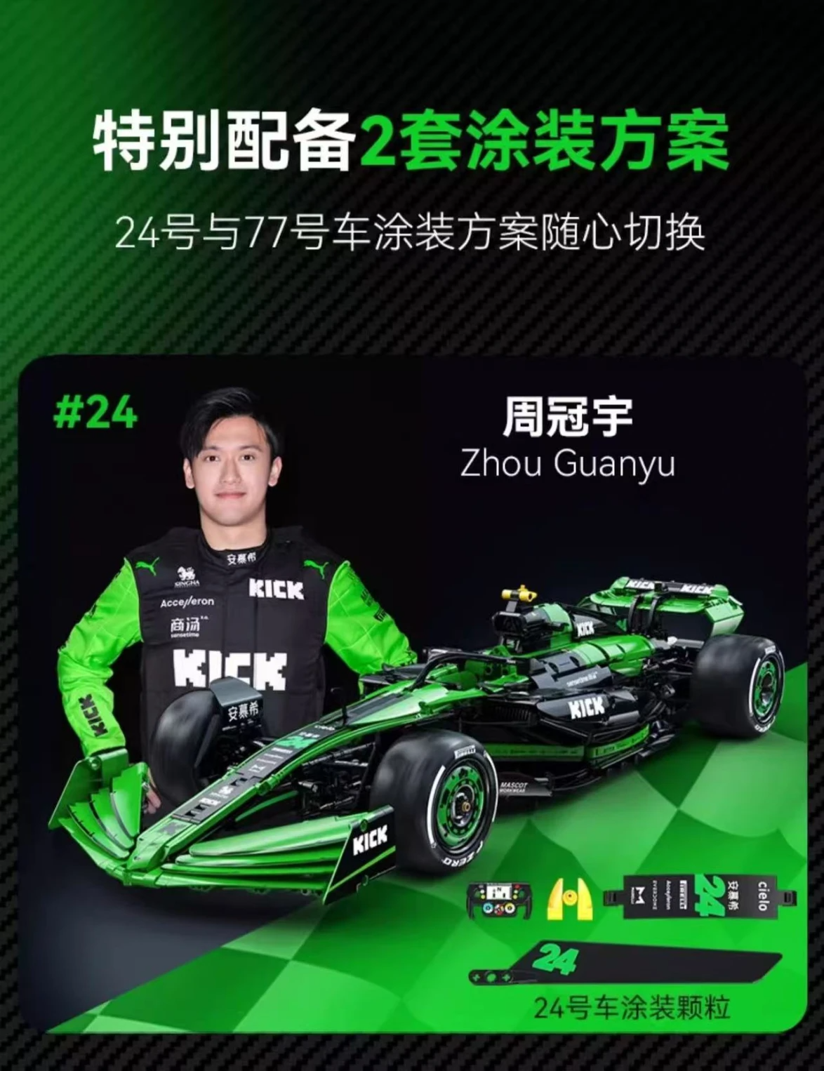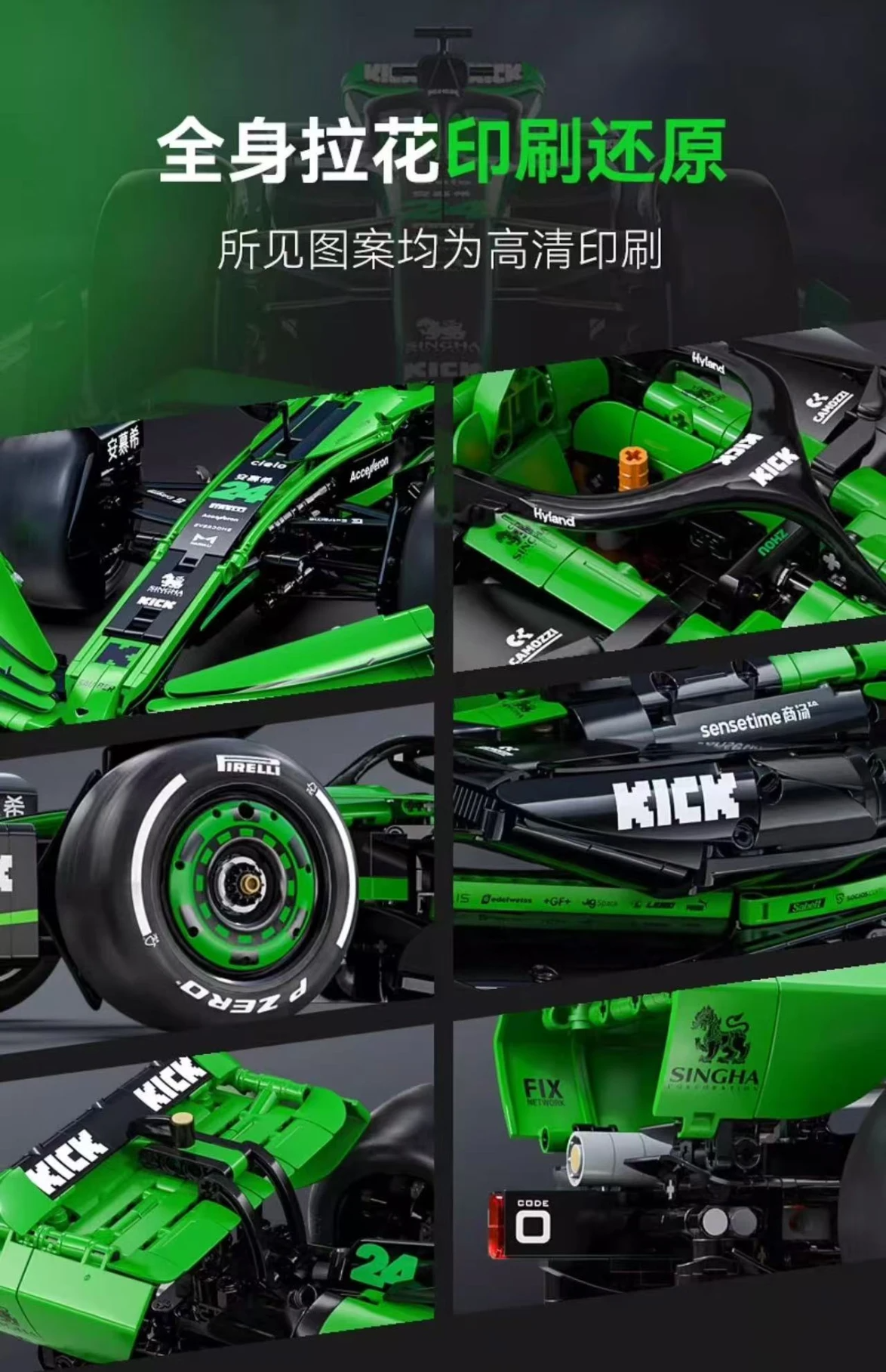 The KICK SAUBER F1 Team C44 model reflects the team’s latest advancements in aerodynamics and chassis optimization. With a striking color scheme, intricate components, and sponsor detailing true to the real race car, every curve and feature has been meticulously recreated to deliver an authentic build experience.